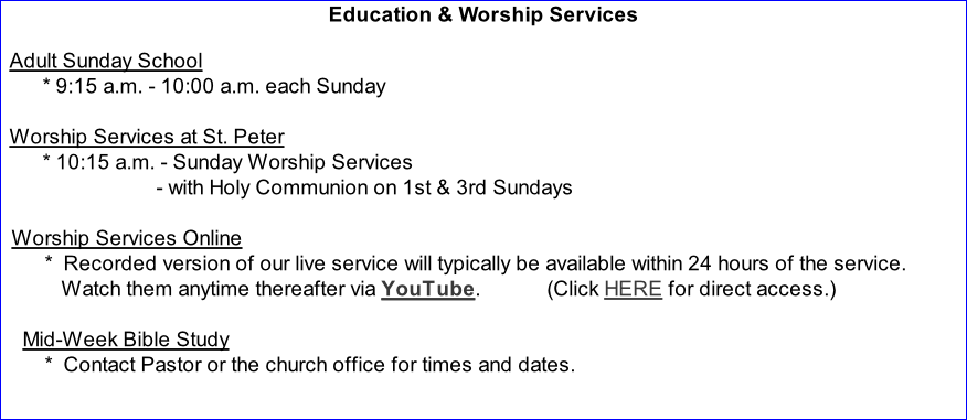 St. Peter Lutheran offers in-person worship services at 10:15 a.m. on Sunday mornings. Our services are published online within one or two days after the event via YouTube links. You can also find links to services from prior months under the ‘Recordings’ page on this website.