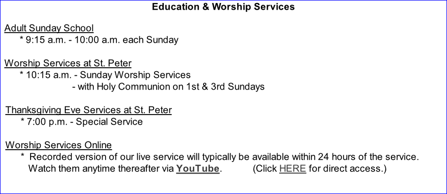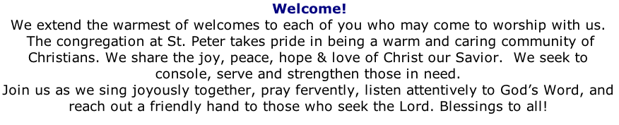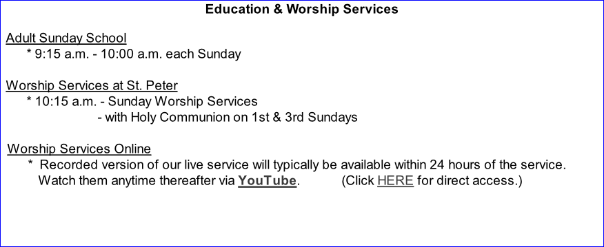 St. Peter Lutheran offers in-person worship services at 10:15 a.m. on Sunday mornings. Our services are published online within one or two days after the event via YouTube links. You can also find links to services from prior months under the ‘Recordings’ page on this website.